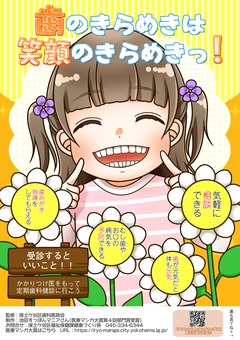 保土ケ谷区では、その一環として、区民の皆様に乳幼児期からの歯科定期健診やセルフケアの重要性を子育て世代をはじめとした多くの人々に伝えるため、第4回医療マンガ大賞「歯科受診のタイミング」部門賞を受賞した「池田すっぽんマニア」さん、そして保土ケ谷区歯科医師会に協力いただき、チラシを作成しました!