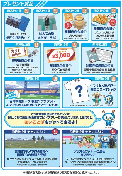 対象期間中に区内商店街の店舗に貼っているクイズに答えて応募すると、抽選で横浜FCホームゲーム観戦ペアチケットやオリジナルTシャツ、保土ケ谷区商店街からのプレゼントが当たるよ!