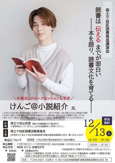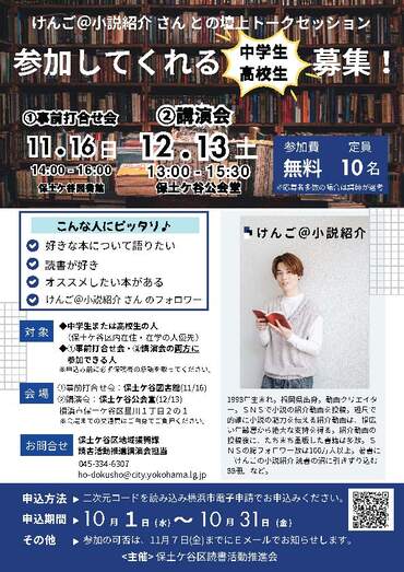 【募集は終了しました!】けんご@小説紹介氏とのトークセッション参加者(中学生・高校生)を募集します。