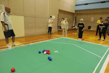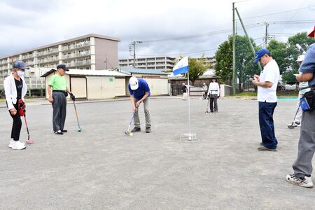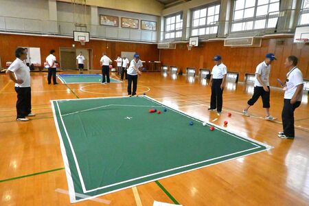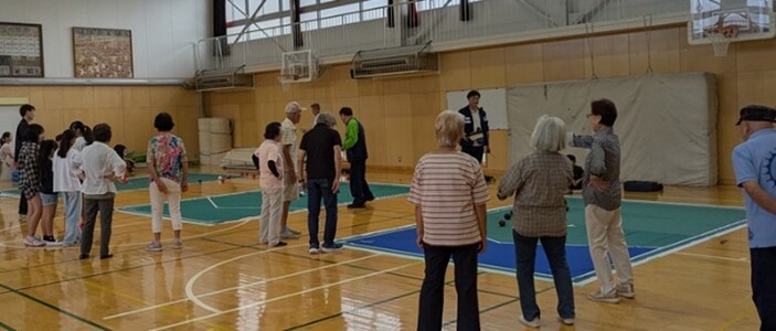第2部の後半では、グラウンドゴルフについての競技説明やスコアのつけ方等を説明のあと、新任者は校庭へ移動してグラウンドゴルフの体験。再任者は体育館にてニュースポーツ研修(モルック、ボッチャ)が行われました。新任の方たちは12月開催のグラウンドゴルフ決勝大会に向け、一所懸命にグラウンドゴルフの体験を行いながらルールの習得、スコアの付け方の研修を行いました。