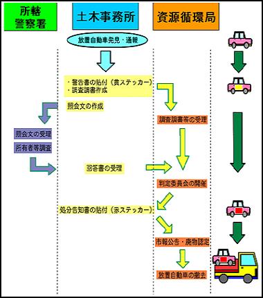 さらに所轄警察が所有権の確認をし、必要に応じて撤去勧告・撤去命令を出し、自主的撤去を進めています。しかし、調査の結果、所有者が判明しない場合は、廃物判定委員会(資源循環局美化推進等担当開催)により、廃物と判定された自動車は市で撤去処分します。