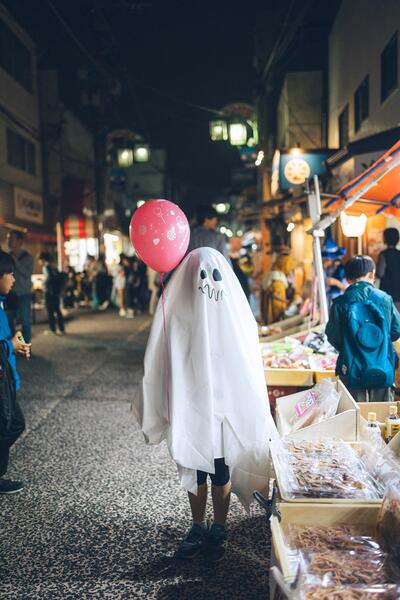 大勢の人で盛り上がる商店街のハロウィンナイトに、フラッと遊びにきたおばけ。