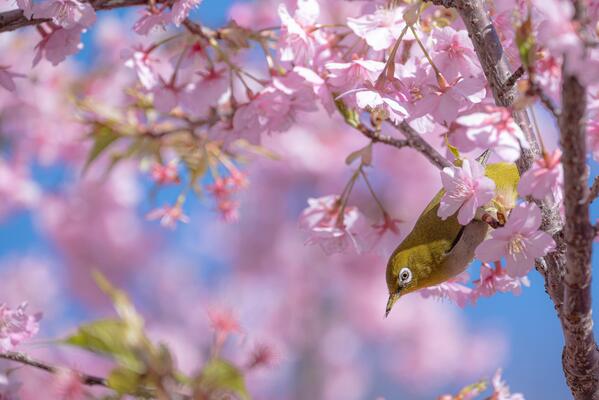 春の息吹が感じられる、ほどがや花憲章に相応しい作品。桜の美しさの中で、軽やかに動き回るメジロの一瞬が鮮やかに写し出されています。