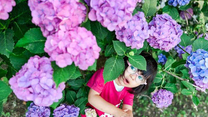 大きな紫陽花の間から、ひょっこりと顔を出す女の子。その愛らしい表情と輝くような瞳がとても印象的です。紫陽花の鮮やかな色彩が女の子を優しく包み込み、まるで童話の一場面のような雰囲気を感じさせてくれます。