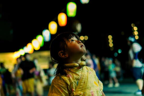 成長の瞬間や本人の期待感が見事に捉えられ、盆踊りの提灯と合わせて切り取った一瞬は、今ここでしか撮れない写真です。