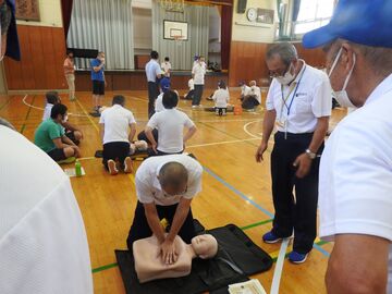続いて行われた研修会では、救命救急講習として、救命救急の手順、胸骨圧迫のやり方、AED(自動体外式除細動器)の使用方法を市スポーツ協会職員の方にご指導いただきました。