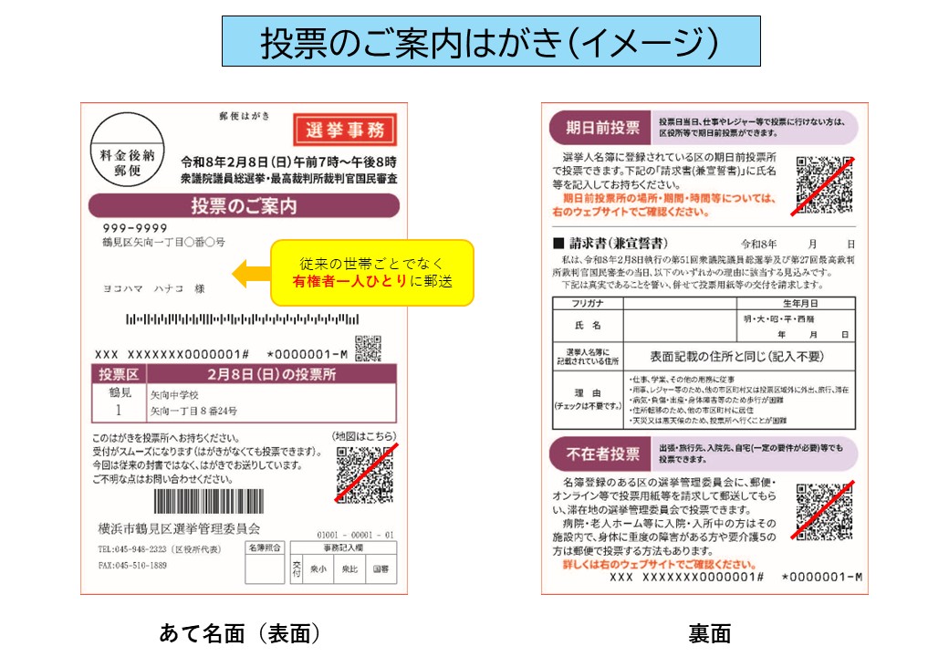 ・今回の「投票のご案内」は、有権者1人につき1枚、ハガキで届くよう変更となりました。 投票に行く際は、ご自身宛てのご案内かを確認してください。