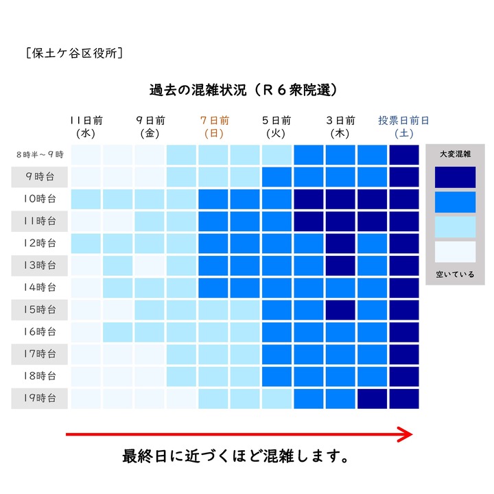 ③ 期日前投票所は、最終日に近づくほど混雑します。特に、最終日の2月7日(土曜日)は大変混雑します。分散投票にご協力をお願いします。
