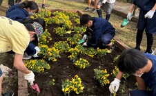 岩崎中学校の生徒と、地域のボランティアの人たちが一緒になって、中学校の花壇への植栽活動などを行っています。