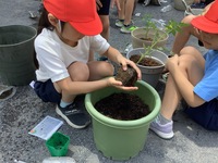 「生活」の授業では、1年生が花を、2年生が野菜を育てます。1年生は花ボランティアの方から花の種を、2年生は種苗屋 さんから野菜の苗を購入しました。子どもたちは家から持ってきた鉢に、購入したばかりの種や苗を丁寧に植えていまし た。花や実がなるのを楽しみに毎日お世話をしているところです。
