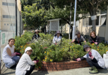 学校の花壇に植栽する生徒たち