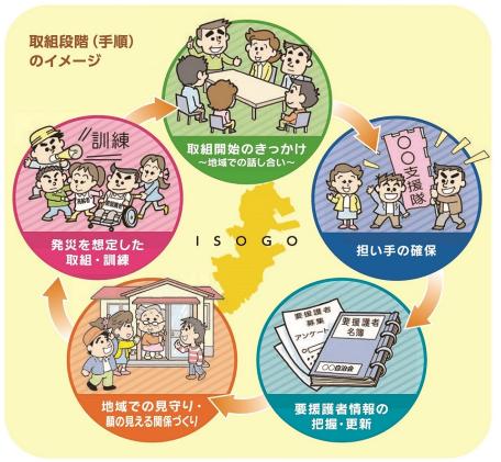 災害時要援護者支援の取組を進めるには、概ね次のような段階があります。