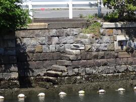 石積護岸、親柱、ヘルムドッグ跡など、今なお残る震災復興時の土木遺産を継承する。