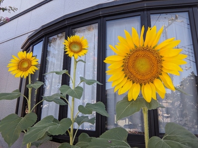 🗨️「ヒマワリが台風にも負けず咲いてくれました。昨年のコスモスに続き、楽しさ倍増です。」