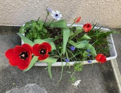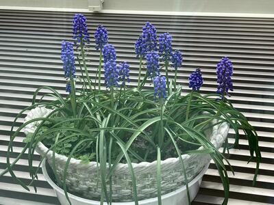 🗨️「おかげさまで、今年もキレイに咲きましたので、チューリップとムスカリの写真を送ります。」