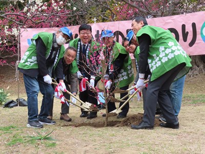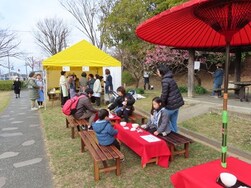 当日は、満開となった見事な梅の花に大勢の方が春の兆しを感じることができました。今年は4年ぶりに模擬店が設けられ、カレー、焼き鳥、焼きそば、甘酒などを梅の花と共に楽しむことができました。昨年度から引き続き、野点、梅トンボ(梅型の竹トンボ)の配布、健康チェックなども設けられた他、会場内では写生大会や演芸大会も実施し、幼児から大人まで会場に訪れた人が笑顔で満たされていました。