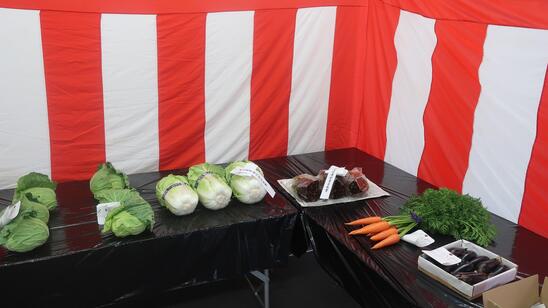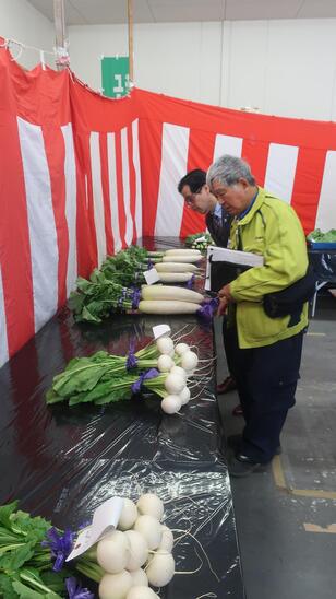 また、建物内では「農産物品評会」が開催され、磯子区内の農家のみなさんが丹精込めて作られた約20点の農産物を、審査委員のみなさんが一点一点、真剣なまなざしで評価していました。