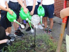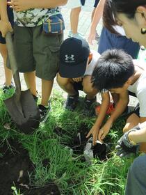 子どもたちが校庭の花壇に電極を埋めています