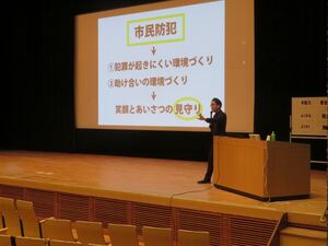 今年度は「地域防犯力とは? ~みんなでつくる安全・安心なまち~」をテーマに、Go! Go!! 市民防犯推進プロジェクト主宰・市民防犯インストラクターの武田信彦氏による講演が行われ、60名の自治会町内会長の皆様が参加されました。