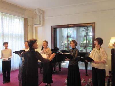 このコンサートは、いそご区民活動支援センター登録の地域ボランティア講師、佐治昌子氏による企画講座「素敵な洋館で歌声を響かせよう“吐く息実践”で免疫力アップ」(6回講座)の参加者の集大成の場でした。