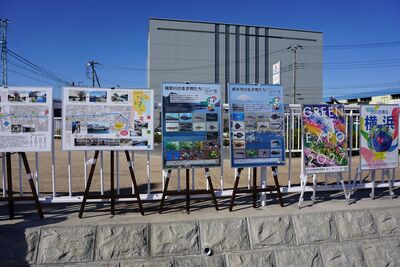 待合場所には堀割川の歴史や生き物の紹介、GREEN×EXPO2027の啓発パネルを設置