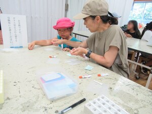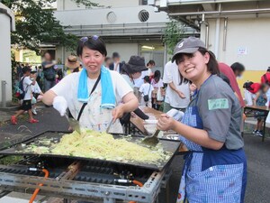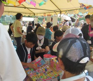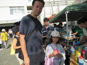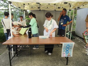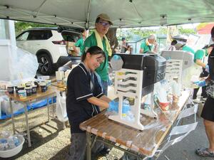 森中ボランティアの8人もお揃いのTシャツを着て各ブースのお手伝い。凍ったチューペットを取り分けたり、大きな声での呼び込みやホットドックの出張販売、わたがしやかき氷作り、くじ引きで景品を渡すなど盛り上げました。