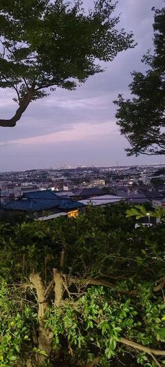 境内の左手にはきれいな夕焼け、晴れていれば富士山が現れます。
