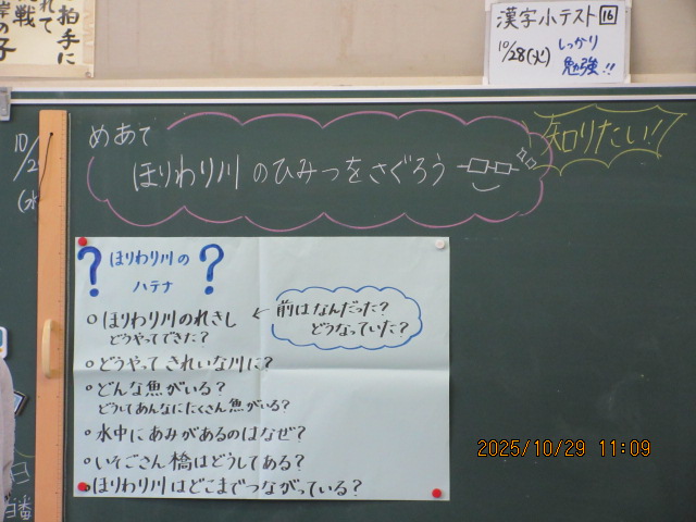 児童たちの思っている「ほりわりがわのハテナ」を挙げて、堀割川の秘密を探っていきます。