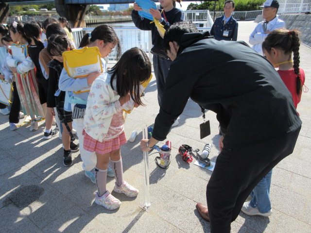 続く11月4日(火)には、堀割川いそご桟橋にて水環境調査(よこはま水辺レポート)の野外授業を行いました。みどり環境局水・土壌環境課の職員から調査の説明を聞きながら、堀割川の様子の観察や現地で採取した川の水で簡易試薬キットを使った水質検査、水の透明度を測る器具で川の実態を直接見てもらい、それぞれの児童が感じた堀割川の水環境をよこはま水辺レポートの調査票に記録してもらいました。川の透明度が高かったことに、多くの児童たちが驚いていました。