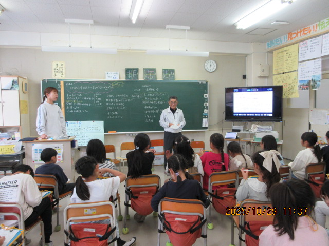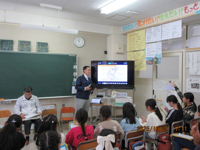 まずは堀割川の歴史や魅力を知ってもらうため10月29日(水)に座学授業を行い、堀割川の魅力づくり実行委員会の原会長から堀割川の歴史や実行委員会のこれまでの活動内容について語っていただきました。児童からは堀割川の歴史やこれまでに感じてきた素朴な疑問について数多くの質問が挙がり、原会長の丁寧な説明に聞き入っていました。