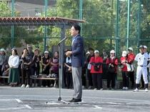 山中市長が始球式を務め、式典終了後は子どもたちに囲まれ交流する姿もありました。
