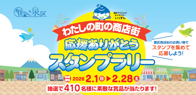 泉区の商店街を応援していただいている皆様へ感謝を込めて、抽選で410名様に商品が当たるスタンプラリーが開催されます!