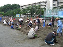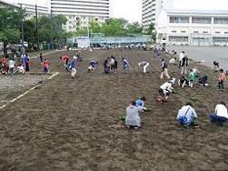 いちょう小学校では校庭の芝生化を推進している財団法人日本サッカー協会の事業「JFAグリーンプロジェクト」により、芝生ポット苗の提供、植付指導などの支援・協力を受け、校庭の一部約1,300平方メートルの芝生化に挑戦します。