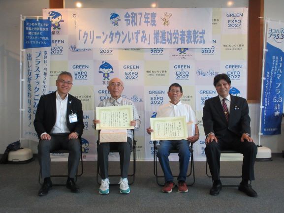 「クリーンタウンいずみ推進功労者」表彰式とは、泉区内において各種美化活動やヨコハマ プラ5.3計画の推進活動を行い、清潔できれいな街づくりの推進等に功績のあった個人または団体に対し、感謝の意を表するとともに、さらに積極的な活動を推進することを目的として表彰を行うものです。