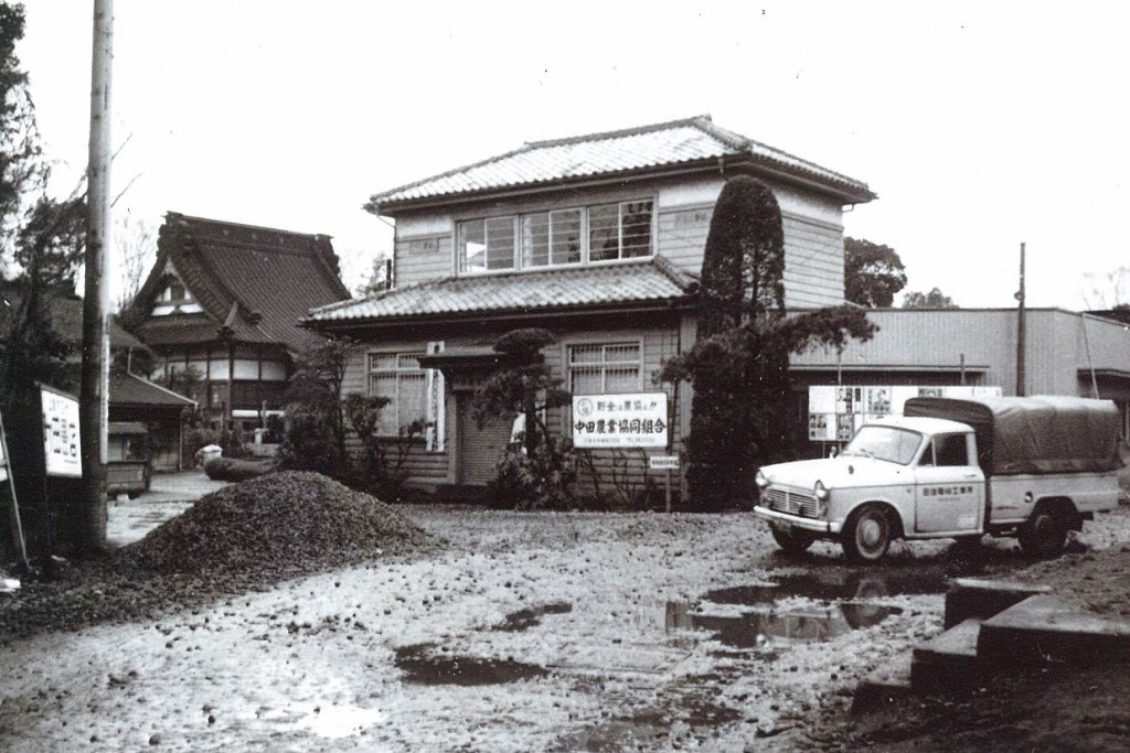 中田寺前にあった中田農業組合、ボンネットトラックが駐車しています。