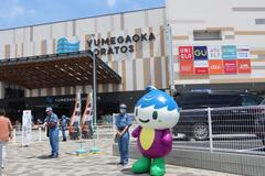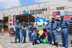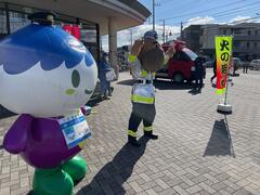 7月25日に開業したゆめが丘ソラトスの前で泉消防団と一緒に団員募集のPRをしたずん!