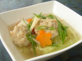 | 作り方 1 白菜は4cmのざく切り。 たけのこは4cm長さの薄切り。 にんじんは花形に切る。 2 豚ひき肉をAに加えて粘りが出るまでよく混ぜ、小さめの一口大の団子を作り、鍋に湯を煮立たせてゆでる。 3 火が通ったら肉団子を取り出し、ゆで汁と別々にしておく。 4 3のゆで汁に水を加えて400mlにして、固形コンソメを加えて煮立て、1を入れて野菜が煮えたら、3の肉団子を入れ、こしょうで味を調える。 | |