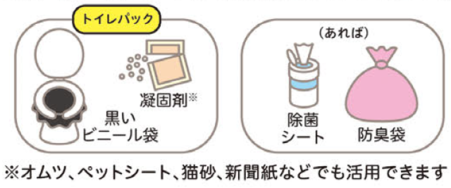 災害による断水や排水管の損傷などの影響で、自宅のトイレが使えなくなる可能性があります。さらに集合住宅では、排水管が使用できるかどうかの確認をせずに水を流すと、上の階の汚水が下の階のトイレからあふれ出ることもあるため、各家庭における災害時のトイレ対策は欠かせません。トイレパックや簡易トイレのほか、いざというときにはゴミ袋と新聞紙等を使い、非常用トイレを作ることも可能です。自宅のトイレが使えない場合を想定して、最低3日分(できれば1週間分)のトイレパック等の備蓄をしましょう。