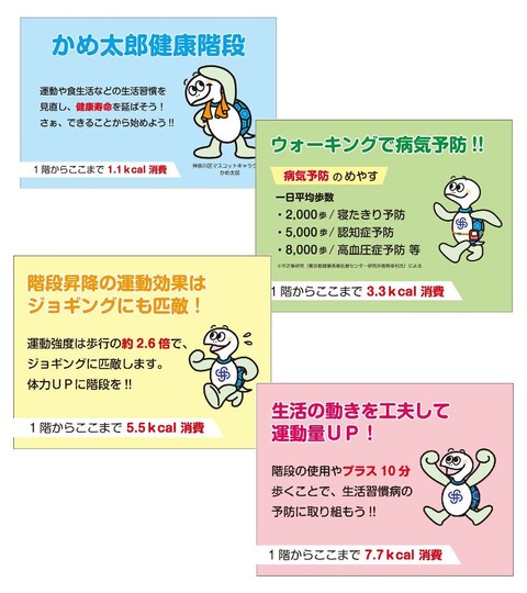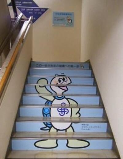 「かめ太郎健康階段」は、22の健康づくりのメッセージを階段や踊り場に表示しています。