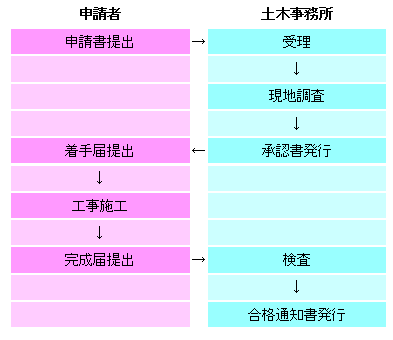 申請書提出時及び完了検査の立会いは、毎週金曜日の午前中までに書類を受け付けたものについて、翌週の火曜日午後に行います(火曜日・金曜日が祝祭日等の場合は翌日等に延期になります。詳しくは、土木事務所担当者にお問い合わせください)。