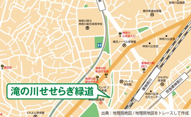 東白楽駅から神奈川区役所まで滝ノ川の上に整備された緑道です。