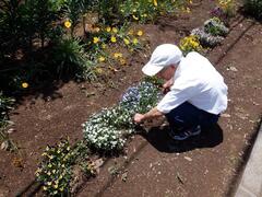 住民から苦情が出るほど泉町交差点の植込みが雑草で覆われており、それが嫌だったので、平成23年ころから雑草取りを行っています。早朝か夕方に4時間程度、週数回、時期によっては毎日活動しています。初めのころは、作業していると色々と苦情などを言われました。また、スコップが入らないくらい根が張っていましたが、除草ができると花を植えてくれる方も増えました。今では数多くの花が咲いており、通りかかった人に「きれいですね」と言われると嬉しくなります。作業する方たちの輪が広がりグループもできました。歳でもう無理と思いながらまた作業に来ているので、やってくれる人が増えてきたのが助かっています。