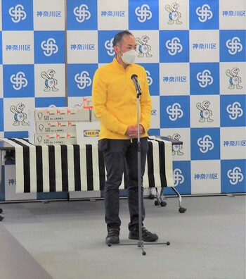 贈呈後は、各自治会町内会を代表して、「ハイツ浦島丘自治会」の前原郁子会長から、お礼のご挨拶をいただきました。