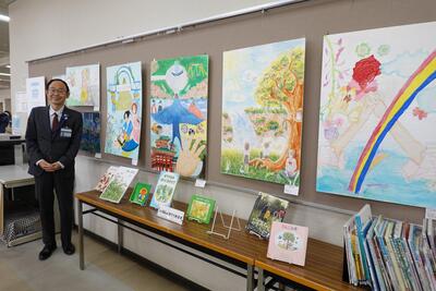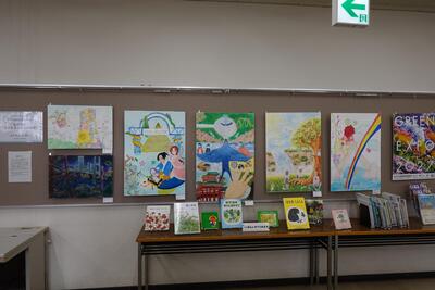 神奈川図書館で展示中① 私の思う幸せを創る明日の風景 区内中学生による絵画展