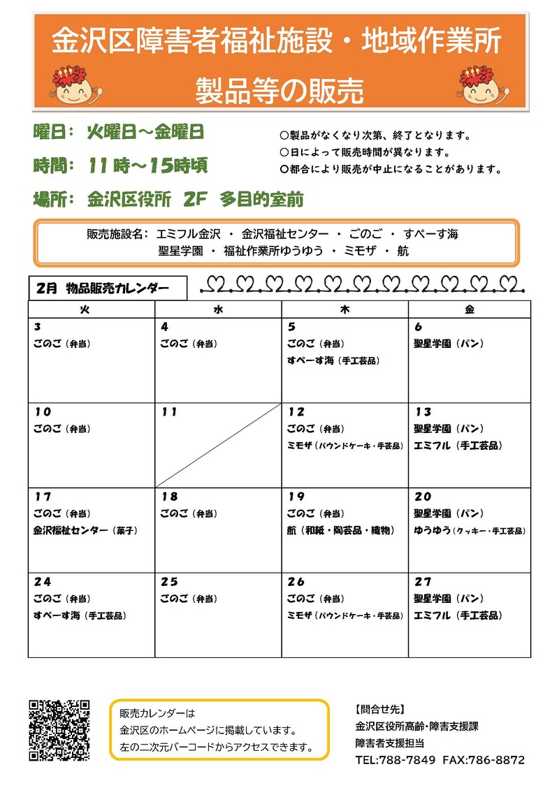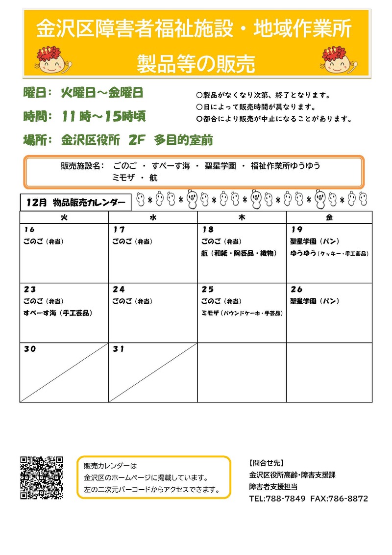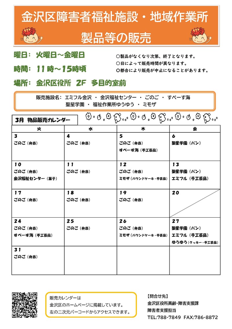 障害のある方が日中活動の場(障害者福祉施設や地域作業所など)で作製した製品等を金沢区役所内で販売しています。