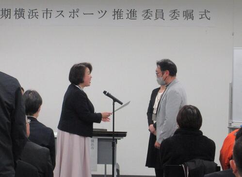 4月1日付で第35期スポーツ推進委員になられた皆さまに対して、市長に代わり、4月3日の委嘱式にて委嘱状をお渡ししました。平日の夜にもかかわらず、多くの方に委嘱式にご出席いただきました。スポーツ推進委員として、お住まいの地域でスポーツ振興を図ること、スポーツを通じて地域の皆さまに元気を届けることへの意気込みを強く感じました。