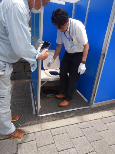 災害時の備えとして、6月12日に区役所で実施した防災研修を紹介します。今回は、台風などの高潮等に備える「止水板」の設置訓練と、非常用トイレ「ハマッコトイレ」の設置訓練を行いました。