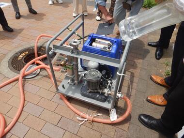 続いてハマッコトイレの設置訓練では、防災ライセンスを持つ方をアドバイザーに迎え、災害時に用いるトイレを設置しました。外囲いの青色のパネルは2〜3人で5分程度で組み立て可能な構造となっています(写真3・4)。その後、発電機とポンプを使用した排水の訓練も実施しました(写真5)。