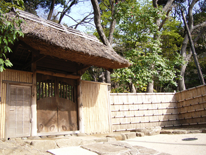 旧川合玉堂別邸の敷地は、京浜急行富岡駅近くの丘陵地に位置しています。駅から別邸に向かうアプローチ道路は急勾配の坂となり、その突き当たりにまず表門が見え、門をくぐると丘陵に抱かれるように主屋が置かれています。