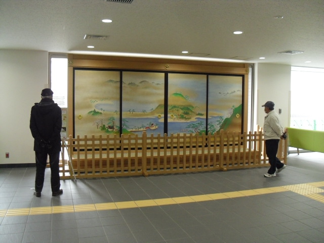 ▲新区庁舎1階に展示中の「金沢八景 野島」の襖絵